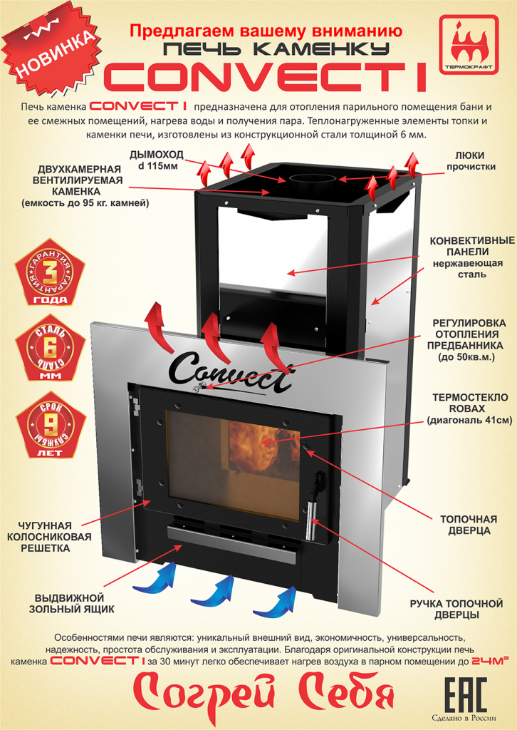 Использовать тепло самой печи?! Вот это ВЕРНЫЙ ответ! Основной особенностью печи , отличающей ее от печей других производителей, является возможность отапливать смежные с парной помещения площадью до 25 кв.м. При этом используется метод конвекции, а тепло парной не расходуется. Одним движением ваша печь для бани легко превратится в отопительную печь, а также порадует Вас и Ваших друзей видом камина. Всем будет тепло, уютно и приятно! И каждый раз, когда к Вам будут приезжать Ваши друзья, Вы будете уверены – все будут довольные!