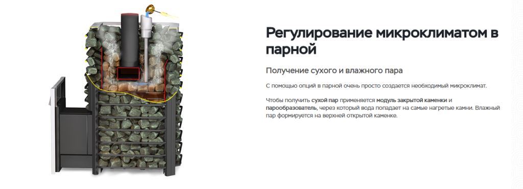 - Возможность использование парообразователя и получения мелкодисперсного пара